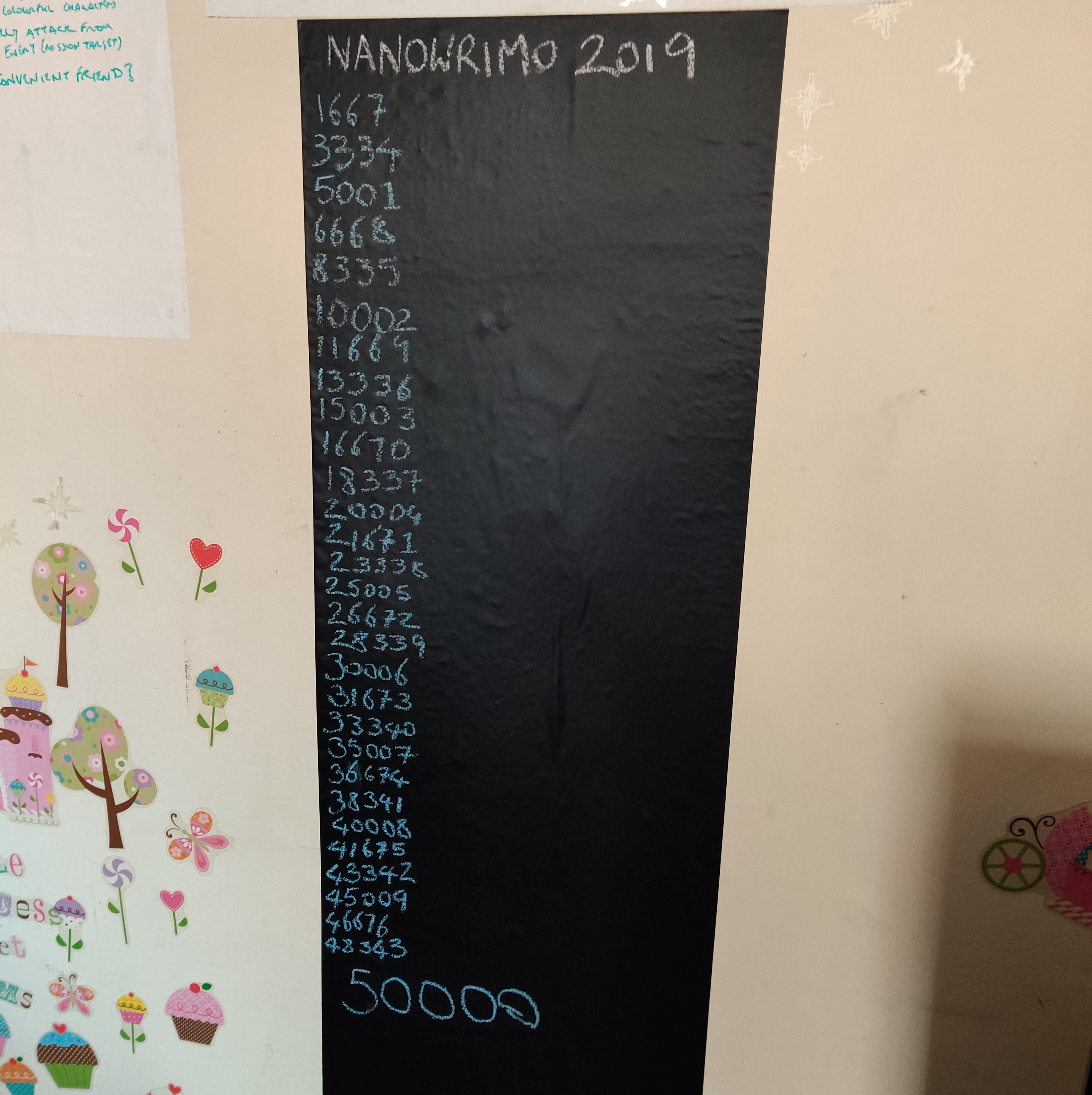 I’ve got a chalk board up to mark milestones in NaNoWriMo, which I’m hoping to get through quickly on my way to the 50,000 word target, and then I’ll extend it out to my true target of 80,000.