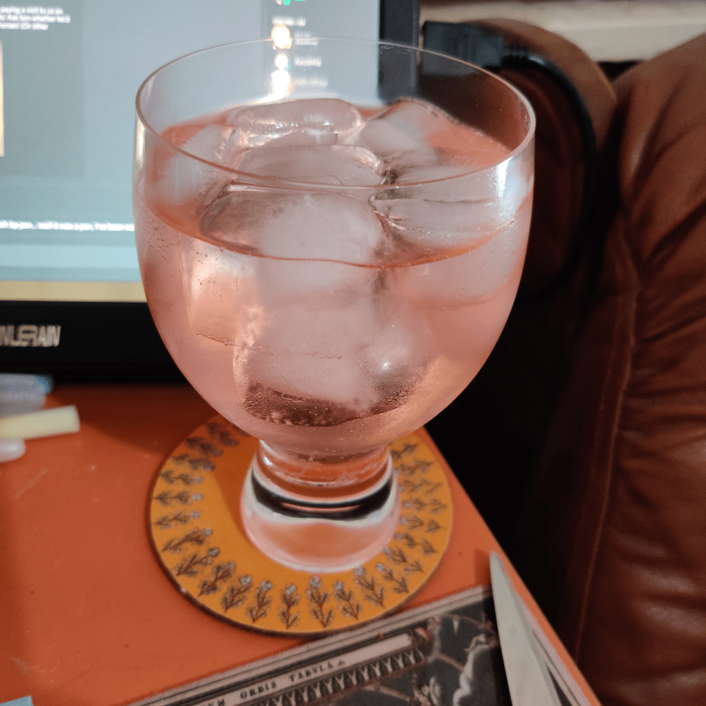 My gin goblet of victory, a healthy measure of Malfy’s Sicilian Blood Orange gin, and tonic, with ice. But please do drink responsibly.